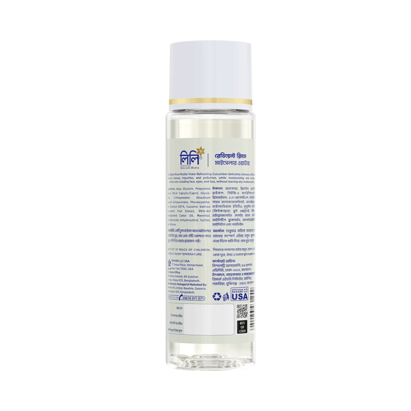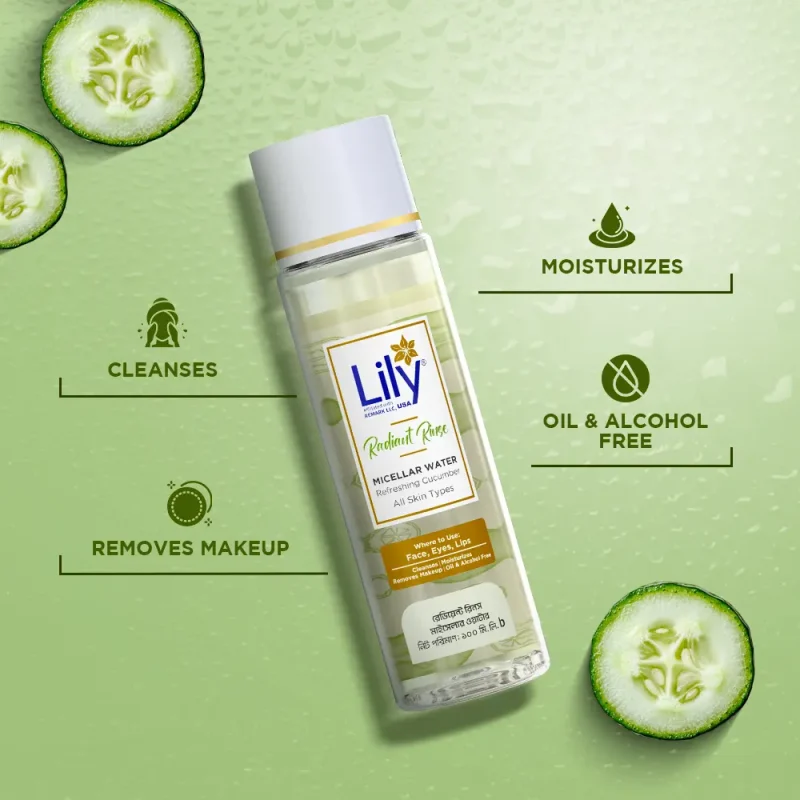Lily Radiant Rinse Micellar Water Refreshing Cucumber delicately cleanses, effortlessly removes makeup, impurities, and pollution, while moisturizing and revitalizing sensitive skin, including the face, eyes, and lips, without leaving any residue behind.