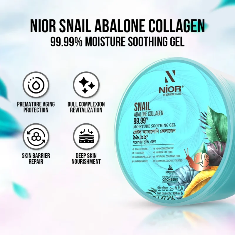 Begin your skin’s revitalization journey with NIOR Snail Abalone Collagen 99.99% Moisture Soothing Gel that dives deep into your cells to restore your skin to its former glory. Infused with the miracles of snail extract that shield your skin from free radicals, eliminate pigmentation, and repair damaged tissues to leave you with an even skin tone. Revel in the bliss of hydrated, supple skin as this snail gel’s intense moisturizing properties replenish your skin, unveiling a youthful, plump texture that is smooth to the touch.