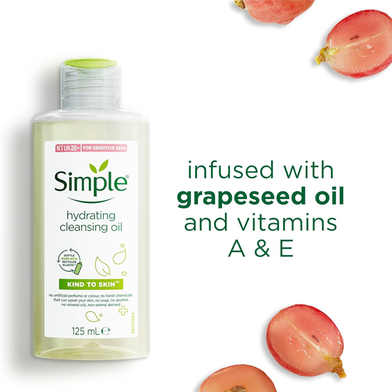 The best cleansing oils are deeply hydrating while leaving no greasy residue. Simple Kind to Skin Hydrating Cleansing Oil is a gentle and effective way to cleanse your skin of impurities and lift away make-up without stripping or irritating the skin. With its perfect blend of gentle cleansers with skin-loving ingredients like grapeseed oil as well as vitamins A and E, this Simple face cleanser leaves your skin cleansed, hydrated and soft.Our cleansing oil contains no artificial perfume or colour, no soap, no mineral oils and no harsh chemicals that can upset your skin. It's hypoallergenic and dermatologically tested and approved to care for all sensitive skin types. Designed with love in the UK, this sensitive skin cleanser is not only kind to skin but also kind to the planet as it comes in a bottle made from 100% recycled plastic.