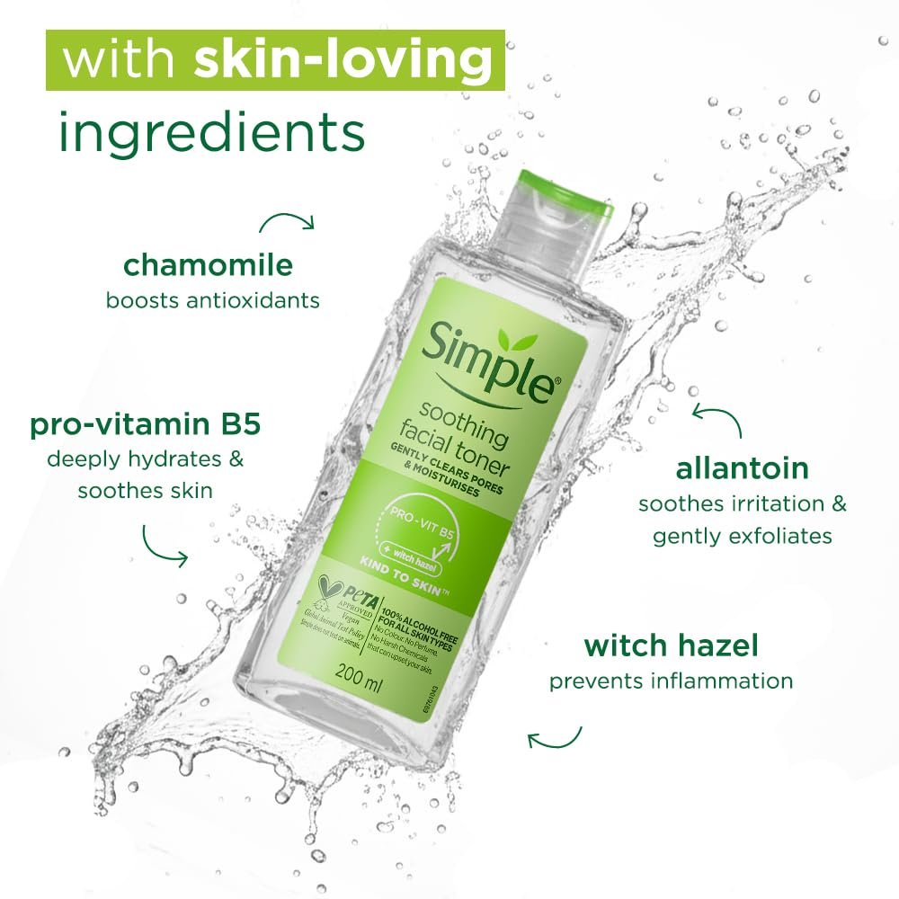 Our Simple Kind to Skin Soothing Facial Toner features a special blend of Simple skin toning goodness to help keep skin refreshed and toned; this blend includes ingredients like Pro Vitamin B5, Chamomile, Witch Hazel and Allantoin.